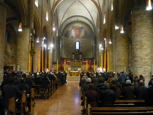 interno della Basilica Cattedrale della Vergine Assunta di stile romanico, la prima pietra fu posta il 3 agosto 1158 giorno della fondazione della città da parte di Federico Barbarossa in seguito alla distruzione della città vecchia di Laus Pompeia