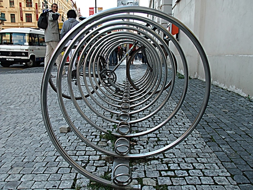 Tag: spirale, bicicletta, persone, strada, metallo, cerchi, parcheggio, spirali, ruote, passanti.