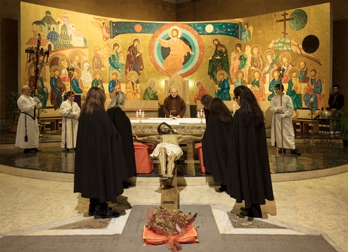 Il simulacro di Gesù Crocifisso viene trasportato a braccia dalle Donne con l'abito nero di rito e deposto con senso di amore materno stravolto dal dolore ai piedi dell'altare.