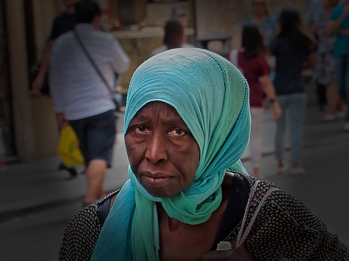 In effetti la donna ha uno sguardo particolarmente espressivo ma ci sono troppi elementi di disturbo attorno a lei per cui, tra cambiare lo sfondo, sfocarlo oppure oscurarlo parzialmente ho scelto la terza possibilità.