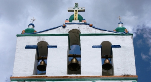A San Juan de Chamula, in Messico, la chiesa ha 3 campane e 3 croci. Questa chiesa è variopinta come tutto nel Chiapas.