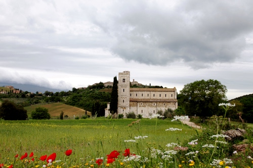 L'abbazia di Sant'Antimo è un complesso monastico premostratense situato presso Castelnuovo dell'Abate, all'interno del comune di Montalcino, in provincia di Siena. Si tratta di una delle architetture più importanti del romanico toscano. Carlo Magno, di ritorno da Roma nell'781, ripercorrendo la grande via creata dai Longobardi, chiamata in seguito "Francigena" perché "strada originata dai Franchi", giunse a Sant'Antimo e pose il suo sigillo sulla fondazione del monastero. Quasi certamente la fondazione ad opera di Carlo Magno è da interpretare come una pura leggenda medievale. Il 29 dicembre 814 un documento di Ludovico il Pio, figlio e successore di Carlo, arricchisce l'abbazia di doni e privilegi. L'abbazia diventa a tutti gli effetti, un'abbazia imperiale. fonte wikipedia