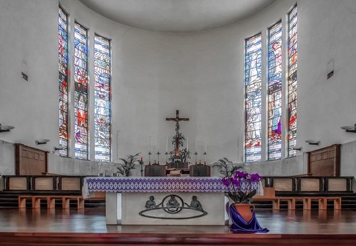 Tag: altare, chiesa, croce, fiori, vetrate, finestre, interno, candele, panche, crocifisso, bianco, colori, tovaglia, viola, scalini, mosaici, candelabri, vaso.