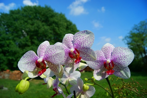 Tag: alberi, orchidee, petali, verde, fiori, cielo, prato, boccioli, nuvole, erba, bocciolo, azzurro, corolle, rosso, bianco, sfocato, gambo, orchidea.