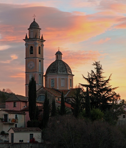 Tag: campanile, cupola, alberi, chiesa, tramonto, nuvole.