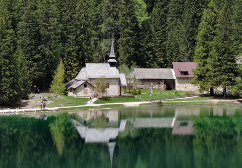 Tag: lago, chiesa, alberi, riflessi, riflesso, verde, montagna, campanile, case, bosco.