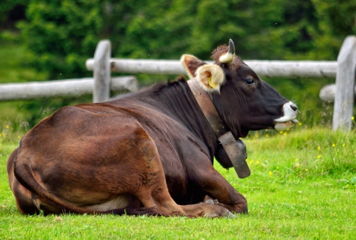 Tag: mucca, staccionata, verde, erba, animale, prato, campanaccio, bovino, corna, muso, pascolo, campo, campana, legno, toro, coda, collare, alberi.