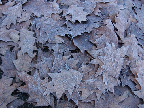 Foglie cadute a terra e coperte di brina.
