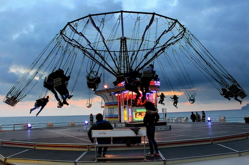 Tag: giostra, persone, mare, nuvole, cielo, seggiolini, luci, catene, azzurro, panchina, ruota, piattaforma, divertimento, girare.