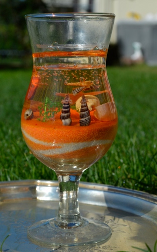 Tag: bicchiere, conchiglie, vassoio, erba, acqua, arancione, verde, vetro, sabbia, calice, prato, trasparenze.
