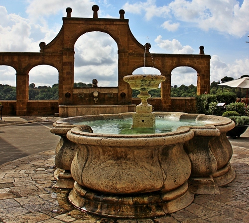 Tag: fontana, acqua, archi, nuvole, cielo, zampillo, alberi, verde, arco, piazza, piante, ombrellone, marmo, architettura, azzurro.