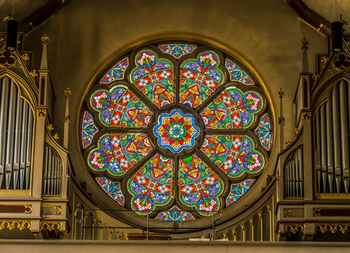 Tag: rosone, chiesa, organo, canne, colori, vetrata, organi, vetro, interno, vetri, cerchio, multicolore.