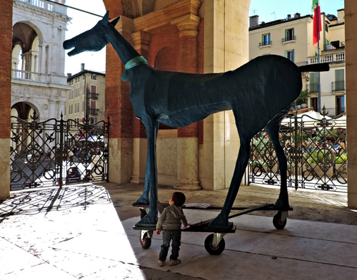 Bella e divertente per il contrasto tra il piccolo bambino e il cavallo gigantesco con rotelle. Anch'io non l'ho vista nelle votazioni. Giovanna