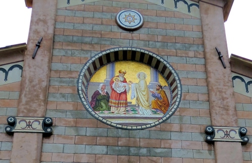 Chiesa della Purificazione di Maria Vergine, il rosone è in mosaico e rappresenta la purificazione di Maria Vergine e la presentazione al Tempio.