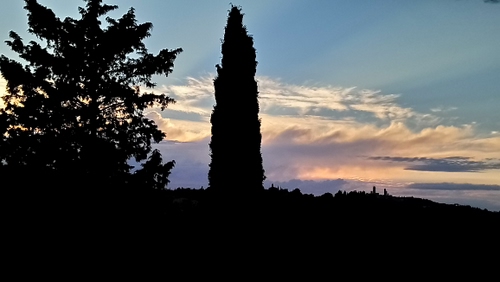 Le torri di San Gimignano con cipresso al tramonto