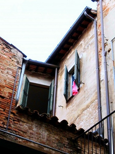 vecchia abitazione,afosa giornata d'estate, tutti gli abitanti sono al riparo dal sole e al fresco tenendo le finestre aperte per far circolare un po' d'aria; un panno rosa steso ad asciugare.