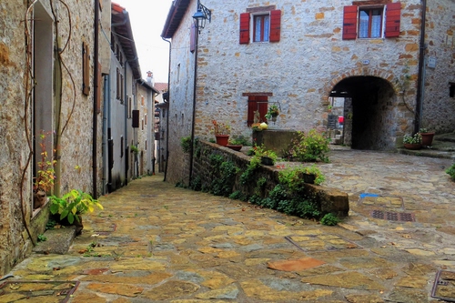 Tag: piante, finestre, via, arco, borgo, verde, strada, case, vicolo, pietre, muretto, rosso, fiori, portico, porte, scorcio, lampione, portone, imposte, paese, vasi.