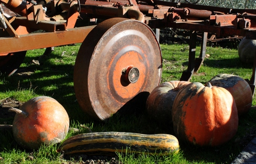 Zucche e zucchina accanto alla ruota di un mezzo agricolo.