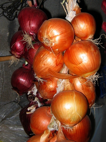 Cipolle di due varietà appese per non prendere umidità.