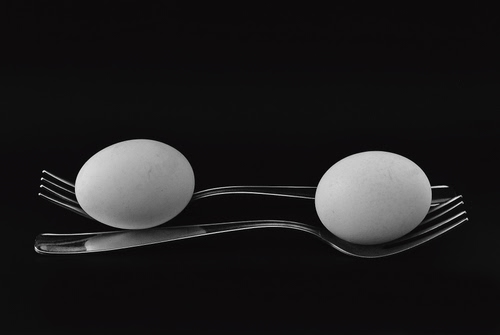 Tag: uova, forchette, due, nero, bianco, bianconero, rebbi, acciaio, posate, metallo, riflesso.