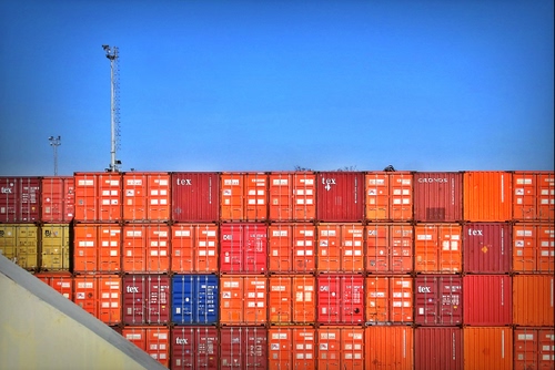 Tag: cielo, azzurro, rosso, container, colori, quadrati, arancione, scritte, blu, merci, geometrie, containers, palo, bianco, pali, fari, arancio, lampioni.