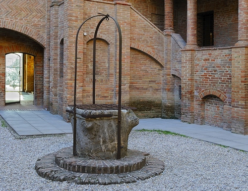 Tag: pozzo, colonne, cortile, mattoni, archi, porta, pietra, ferro, grata, arco, ghiaia, marciapiede, corte, grigio, chiostro.