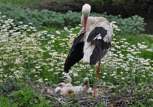Tag: margherite, cicogna, pulcini, prato, becco, nido, uccelli, piccoli, ali, uccello, fiori.