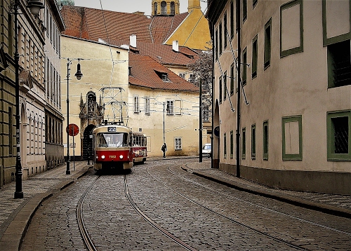 Tag: tram, strada, finestre, case, rosso, rotaie, binari, lampioni, tetti, via, palazzi, fili, filobus.
