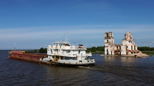 Chiatta a motore davanti ai ruderi della chiesa di Krochino, sul Lago Bianco, parte del grande canale Volga-Baltico.