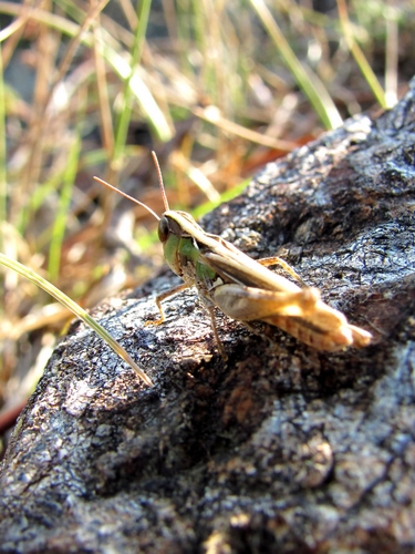 Simpatica cavalletta immobile sulla roccia riscaldata dal sole.