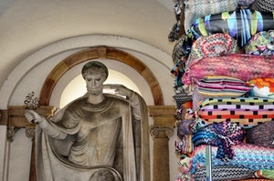 Contrasto tra la statua di Sant'Ambrogio e moderne installazioni a cuscini