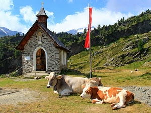 Piccola chiesa con mucche