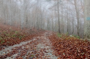 Una bella strada nel bosco, con atmosfera resa magica dalla nebbia