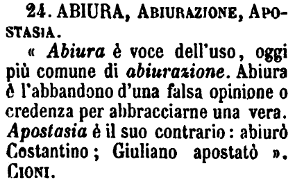 Abiura, Abiurazione, Apostasia - « Abiura è voce dell'uso, oggi più comune di abiurazione. Abiura è l'abbandono d'una falsa opinione o credenza per abbracciarne una vera. Apostasia è il suo contrario: abiurò Costantino; Giuliano apostatò ». Cioni [immagine]