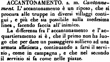 | Accantonamento - s. m. Cantonnement. L'accantonamento è un riposo, che si procura alle truppe in diversi villaggi contigui, e più che sia possibile sulla medesima linea, facendo faccia all'inimico.