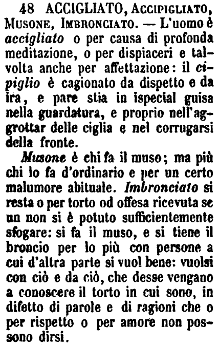 Accigliato, Accipigliato, Musone, Imbronciato - L'uomo è accigliato o per causa di profonda meditazione, o per dispiaceri e talvolta anche per affettazione: il cipiglio è cagionato da dispetto e da ira, e pare stia in ispecial guisa nella guardatura, e proprio nell'aggrottar delle ciglia e nel corrugarsi della fronte.