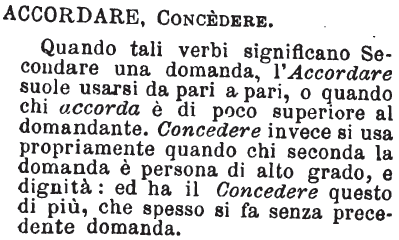 | Accordare, Concedere - Quando tali verbi significano Secondare una domanda, l'Accordare suole usarsi da pari a pari, o quando chi accorda è di poco superiore al domandante. Concedere invece si usa propriamente quando chi seconda la domanda è persona di alto grado, e dignità: ed ha il Concedere questo di più, che spesso si fa senza precedente domanda. [immagine] |