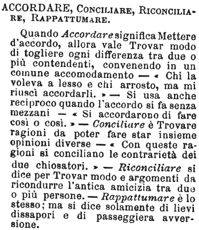 | Accordare, Conciliare, Riconciliare, Rappattumare - Quando Accordare significa Mettere d'accordo, allora vale Trovar modo di togliere ogni differenza tra due o più contendenti, convenendo in un comune accomodamento - « Chi la voleva a lesso e chi arrosto, ma mi riuscì accordarli. » - Si usa anche reciproco quando l'accordo si fa senza mezzani - « Si accordarono di fare così o così. » - Conciliare è Trovare ragioni da poter fare star insieme opinioni diverse - « Con queste ragioni si conciliano le contrarietà dei due chiosatori. » - Riconciliare si dice per Trovar modo e argomenti da ricondurre l'antica amicizia tra due o più persone. - Rappattumare è lo stesso; ma si dice solamente di lievi dissapori e di passeggiera avversione. [immagine] |