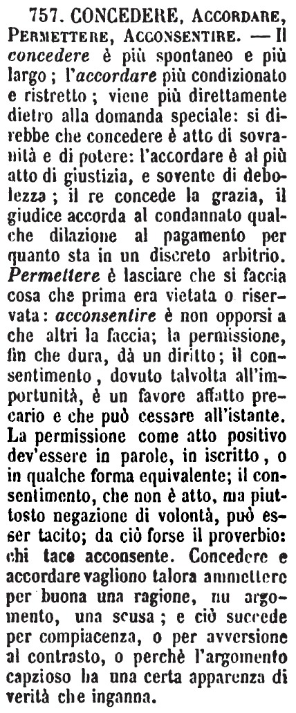 | Concedere, Accordare, Permettere, Acconsentire - Il concedere è più spontaneo e più largo; l'accordare più condizionato e ristretto; viene più direttamente dietro alla domanda speciale: si direbbe che concedere è atto di sovranità e di potere: l'accordare è al più atto di giustizia, e sovente di debolezza; il re concede la grazia, il giudice accorda al condannato qualche dilazione al pagamento per quanto sta in un discreto arbitrio. Permettere è lasciare che si faccia cosa che prima era vietata o riservata: acconsentire è non opporsi a che altri la faccia; la permissione fin che dura, dà un diritto; il consentimento, dovuto talvolta all'importunità, è un favore affatto precario e che può cessare all'istante. La permissione come atto positivo dev'essere in parole, in iscritto, o in qualche forma equivalente; il consentimento, che non è atto, ma piuttosto negazione di volontà, può esser tacito; da ciò forse il proverbio: chi tace acconsente. Concedere e accordare vagliono talora ammettere per buona una ragione, un argomento, una scusa; e ciò succede per compiacenza, o per avversione al contrasto, o perchè l'argomento capzioso ha una certa apparenza di verità che inganna. [immagine] |
