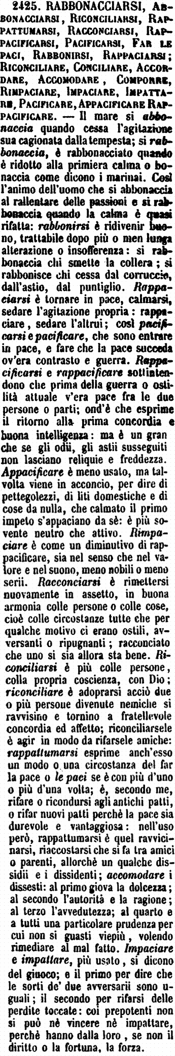 | Rabbonacciarsi, Abbonacciarsi, Riconciliarsi, Rappattumarsi, Racconciarsi, Rappacificarsi, Pacificarsi, Far le paci, Rabbonirsi, Rappaciarsi; Riconciliare, Conciliare, Accordare, Accomodare, Comporre, Rimpaciare, Impaciare, Impattare, Pacificare, Appacificare, Rappacificare - Il mare si abbonaccia quando cessa l'agitazione sua cagionata dalla tempesta; si rabbonaccia, è rabbonacciato quando è ridotto alla primiera calma o bonaccia come dicono i marinai. Così l'animo dell'uomo che si abbonaccia al rallentare delle passioni e si rabbonaccia quando la calma è quasi rifatta: rabbonirsi è ridivenir buono, trattabile dopo più o men lunga alterazione o insofferenza: si rabbonaccia chi smette la collera; si rabbonisce chi cessa dal corruccio, dall'astio, dal puntiglio. Rappaciarsi è tornare in pace, calmarsi, sedare l'agitazione propria: rappaciare, sedare l'altrui; così pacificarsi e pacificare, che sono entrare in pace, e fare che la pace succeda ov'era contrasto e guerra. Rappacificarsi e rappacificare sottintendono che prima della guerra o ostilità attuale v'era pace fra le due persone o parti; ond'è che esprime il ritorno alla prima concordia e buona intelligenza: ma è un gran che se gli odii, gli astii susseguiti non lasciano reliquie e freddezza. Appacificare è meno usato, ma talvolta viene in acconcio, per dire di pettegolezzi, di liti domestiche e di cose da nulla, che calmato il primo impeto s'appaciano da sè: è più sovente neutro che attivo. Rimpaciare è come un diminutivo di rappacificare, sia nel senso che nel valore e nel suono, meno nobili o meno serii. Racconciarsi è rimettersi nuovamente in assetto, in buona armonia colle persone o colle cose, cioè colle circostanze tutte che per qualche motivo ci erano ostili, avversanti o ripugnanti; racconciato che uno si sia allora sta bene. Riconciliarsi è più colle persone, colla propria coscienza, con Dio; riconciliare è adoprarsi acciò due o più persone divenute nemiche si ravvisino e tornino a fratellevole concordia ed affetto; riconciliarsele è agir in modo da rifarsele amiche: rappattumarsi esprime anch'esso un modo o una circostanza del far la pace o le paci se è con più d'uno o più d'una volta; è, secondo me, rifare o ricondursi agli antichi patti, o rifar nuovi patti perchè la pace sia durevole e vantaggiosa: nell'uso però, rappattumarsi è quel ravvicinarsi, riaccostarsi che si fa tra amici o parenti, allorchè un qualche dissidii e i dissidenti; accomodare i dissesti: al primo giova la dolcezza; al secondo l'autorità e la ragione; al terzo l'avvedutezza; al quarto e a tutti una particolare prudenza per cui non si guasti viepiù, volendo rimediare al mal fatto. Impaciare e impattare, più usato, si dicono del giuoco; e il primo per dire che le sorti de' due avversarii sono uguali; il secondo per rifarsi delle perdite toccate: coi prepotenti non si può nè vincere nè impattare, perchè hanno dalla loro, se non il diritto o la fortuna, la forza. [immagine] |