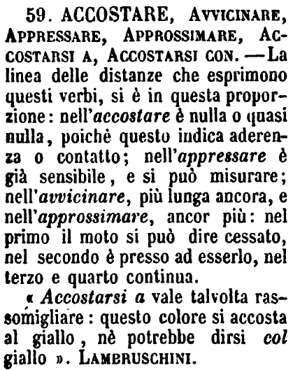 | Accostare, Avvicinare, Appressare, Approssimare, Accostarsi a, Accostarsi con - La linea delle distanze che esprimono questi verbi, si è in questa proporzione: nell'accostare è nulla o quasi nulla, poichè questo indica aderenza o contatto; nell'appressare è già sensibile, e si può misurare; nell'avvicinare, più lunga ancora, e nell'approssimare, ancor più: nel primo il moto si può dire cessato, nel secondo è presso ad esserlo, nel terzo e quarto continua.