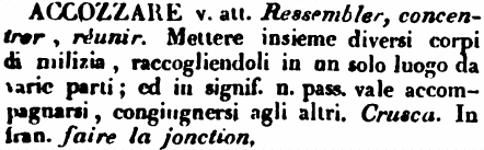 | Accozzare - v. att. Ressembler, concentrer, réunir. Mettere insieme diversi corpi di milizia, raccogliendoli in un solo luogo da varie parti; ed in signif. n. pass. vale accompagnarsi, congiungersi agli altri. Crusca. In fran. faire la jonction. [immagine] |
