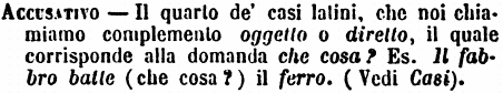 Accusativo - Il quarto de' casi latini, che noi chiamiamo complemento oggetto o diretto, il quale corrisponde alla domanda che cosa? Es. Il fabbro batte (che cosa?) il ferro. (Vedi Casi). [immagine]