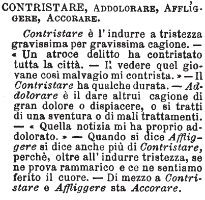 | Contristare, Addolorare, Affliggere, Accorare - Contristare è l’indurre a tristezza gravissima per gravissima cagione. - « Un atroce delitto ha contristato tutta la città. – Il vedere quel giovane così malvagio mi contrista.» - Il Contristare ha qualche durata. - Addolorare è il dare altrui cagione di gran dolore o dispiacere, o si tratti di una sventura o di mali trattamenti. - « Quella notizia mi ha proprio addolorato. » - Quando si dice Affliggere si dice anche più di Contristare, perché, oltre all’indurre tristezza, se ne prova rammarico e ce ne sentiamo ferito il cuore. – Di mezzo a Contristare e Affliggere sta Accorare. [immagine] |