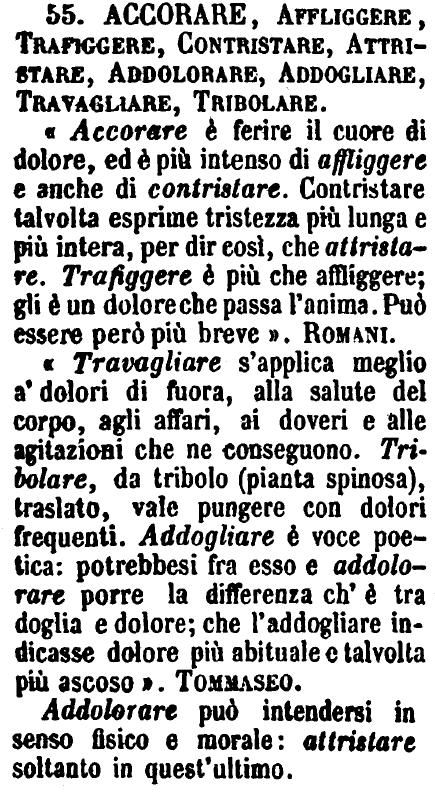 Accorare, Affliggere, Trafiggere, Contristare, Attristare, Addolorare, Addogliare, Travagliare, Tribolare - «Accorare è ferire il cuore di dolore, ed è più intenso di affliggere e anche di contristare. Contristare talvolta esprime tristezza più lunga e più intera, per dir così, che attristare. Trafiggere è più che affliggere; gli è un dolore che passa l'anima. Può essere però più breve». Romani.