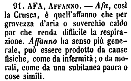 | Afa, Affanno - Afa, così la Crusca, è quell'affanno che per gravezza d'aria o soverchio caldo par che renda difficile la respirazione. Affanno ha senso più generale, può essere prodotto da cause fisiche, come da infermità; o da morali, come da una subitanea paura o cose simili. [immagine] |