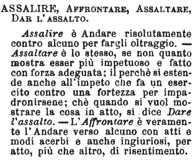| Assalire, Affrontare, Assaltare, Dar l’assalto - Assalire è Andare risolutamente contro alcuno per fargli oltraggio. - Assaltare è lo stesso, se non quanto mostra esser più impetuoso e fatto con forza adeguata; il perchè si estende anche all'impeto che fa un esercito contro una fortezza per impadronirsene; chè quando si vuol mostrare la cosa in atto, si dice Dare l'assalto. - L'Affrontare è veramente l'Andare verso alcuno con atti e modi acerbi e anche ingiuriosi, per atto, più che altro, di risentimento. [immagine] |