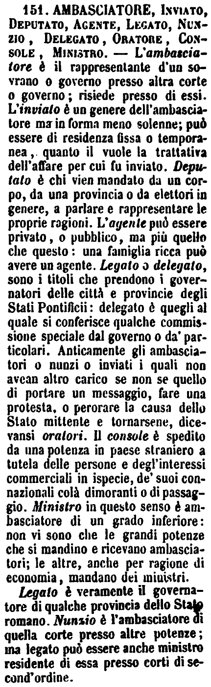 Ambasciatore, Inviato, Deputato, Agente, Legato, Nunzio, Delegato, Oratore, Console, Ministro - L'ambasciatore è il rappresentante d'un sovrano o governo presso altra corte o governo; risiede presso di essi. L'inviato è un genere dell'ambasciatore ma in forma meno solenne; può essere di residenza fissa o temporanea, quanto il vuole la trattativa dell'affare per cui fu inviato. Deputato è chi vien mandato da un corpo, da una provincia o da elettori in genere, a parlare e rappresentare le proprie ragioni. L'agente può essere privato, o pubblico, ma più quello che questo: una famiglia ricca può avere un agente. Legato o delegato, sono i titoli che prendono i governatori delle città e provincie degli Stati Pontificii: delegato è quegli al quale si conferisce qualche commissione speciale dal governo o da' particolari. Anticamente gli ambasciatori o nunzi o inviati i quali non avean altro carico se non se quello di portare un messaggio, fare una protesta, o perorare la causa dello Stato mittente e tornarsene, dicevansi oratori. Il console è spedito da una potenza in paese straniero a tutela delle persone e degl'interessi commerciali in ispecie, de' suoi connazionali colà dimoranti o di passaggio. Ministro in questo senso è ambasciatore di un grado inferiore: non vi sono che le grandi potenze che si mandino e ricevano ambasciatori; le altre, anche per ragione di economia, mandano dei ministri.