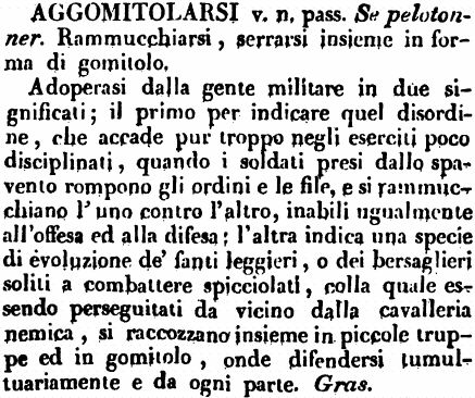 Adoperasi dalla gente militare in due significati; il primo per indicare quel disordine, che accade pur troppo negli eserciti poco disciplinati, quando i soldati presi dallo spavento rompono gli ordini e le file, e si rammucchiano l'uno contro l'altro, inabili ugualmente all'offesa ed alla difesa; l'altra indica una specie di evoluzione de' fanti leggieri, o dei bersaglieri soliti a combattere spicciolati, colla quale essendo perseguitati da vicino dalla cavalleria nemica, si raccozzano insieme in piccole truppe ed in gomitolo, onde difendersi tumultuariamente e da ogni parte. Gras. [immagine] |