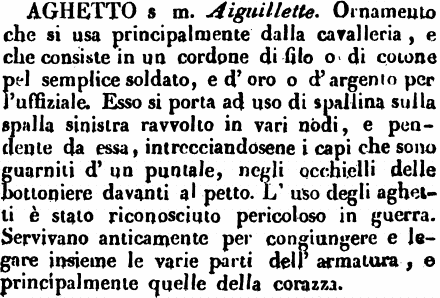 | Aghetto - s. m. Aiguillette. Ornamento che si usa principalmente dalla cavalleria, e che consiste in un cordone di filo o di cotone pel semplice soldato, e d'oro o d'argento per l'uffiziale. Esso si porta ad uso di spallina sulla spalla sinistra ravvolto in vari nodi, e pendente da essa, intrecciandosene i capi che sono guarniti d'un puntale, negli occhielli delle bottoniere davanti al petto. L'uso degli aghetti è stato riconosciuto pericoloso in guerra. Servivano anticamente per congiungere e legare insieme le varie parti dell'armatura, e principalmente quelle della corazza. [immagine] |